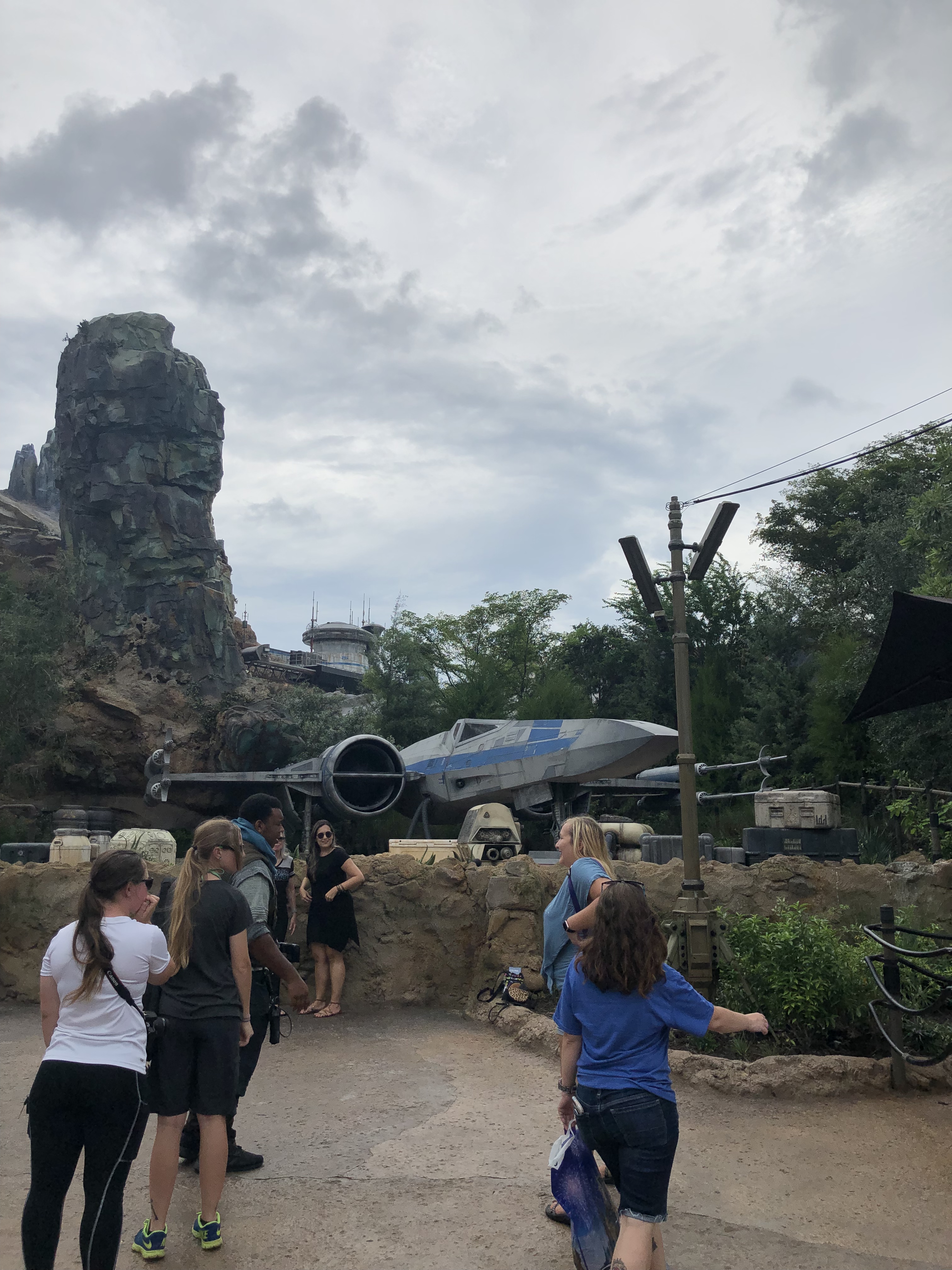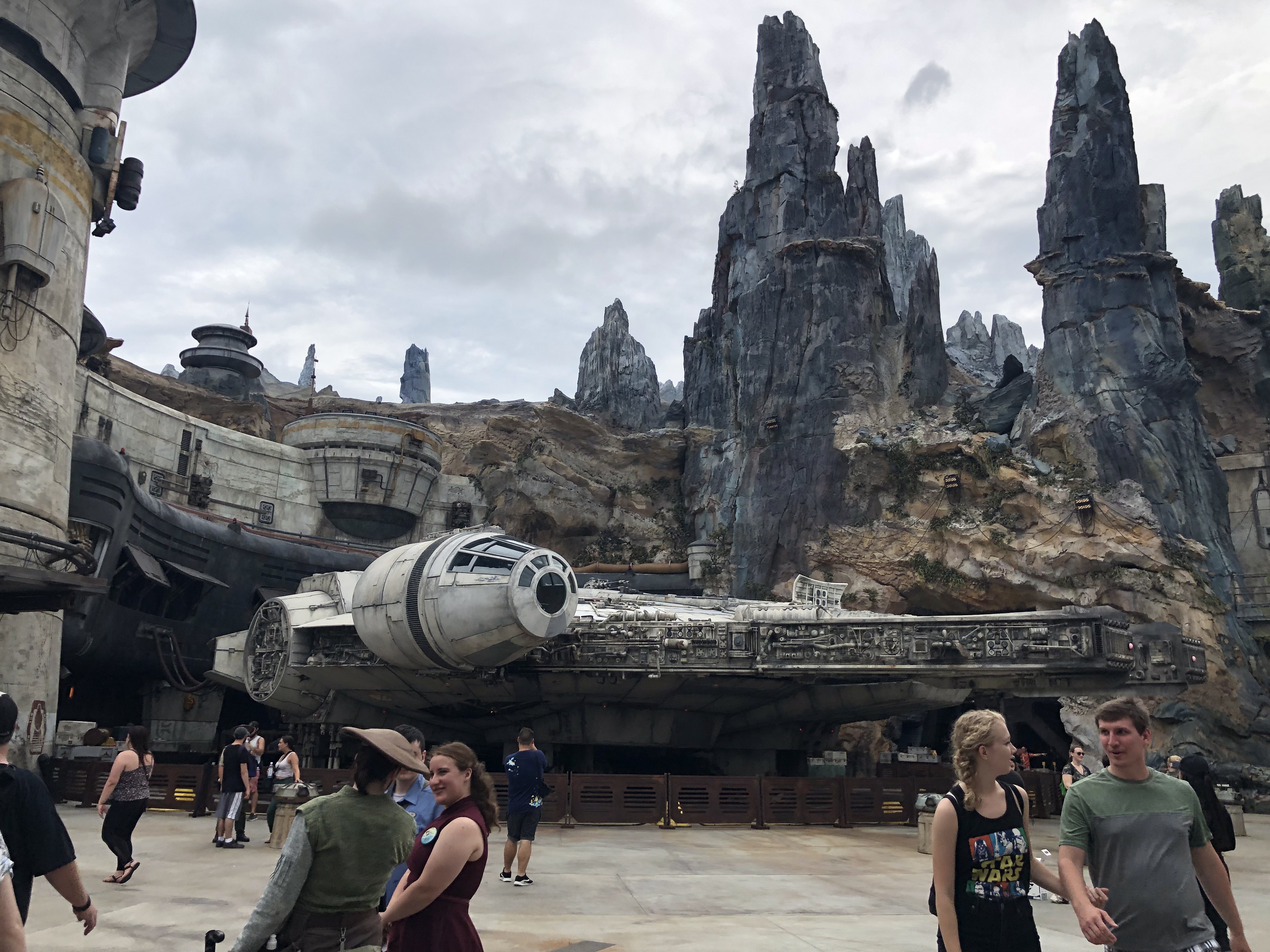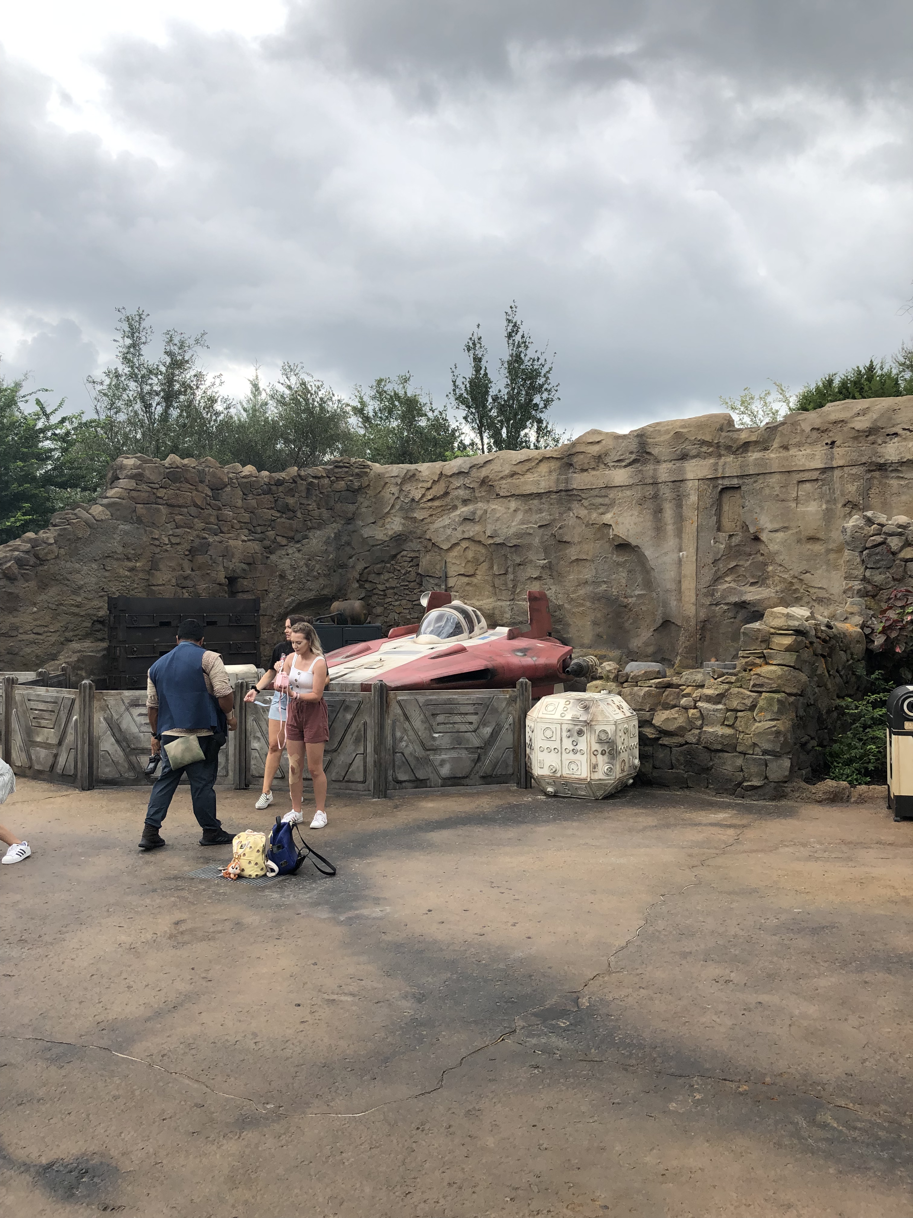 After some photos and exploring we turned the corner to the focal piece of the land, the number one photo spot and what everyone wants to see. The millennium falcon. It was huge and really incredible. And yes we did go and get photos out in front of it first. Then it was time to do what we had all been waiting for, join the queue for Millennium Falcon: Smugglers Run.